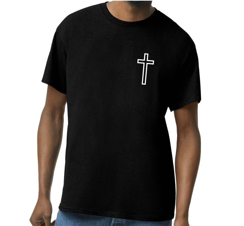 Jesus is the Way, the Truth and The Life printed on black gildan softstyle tshirt. Cross printed on the front
