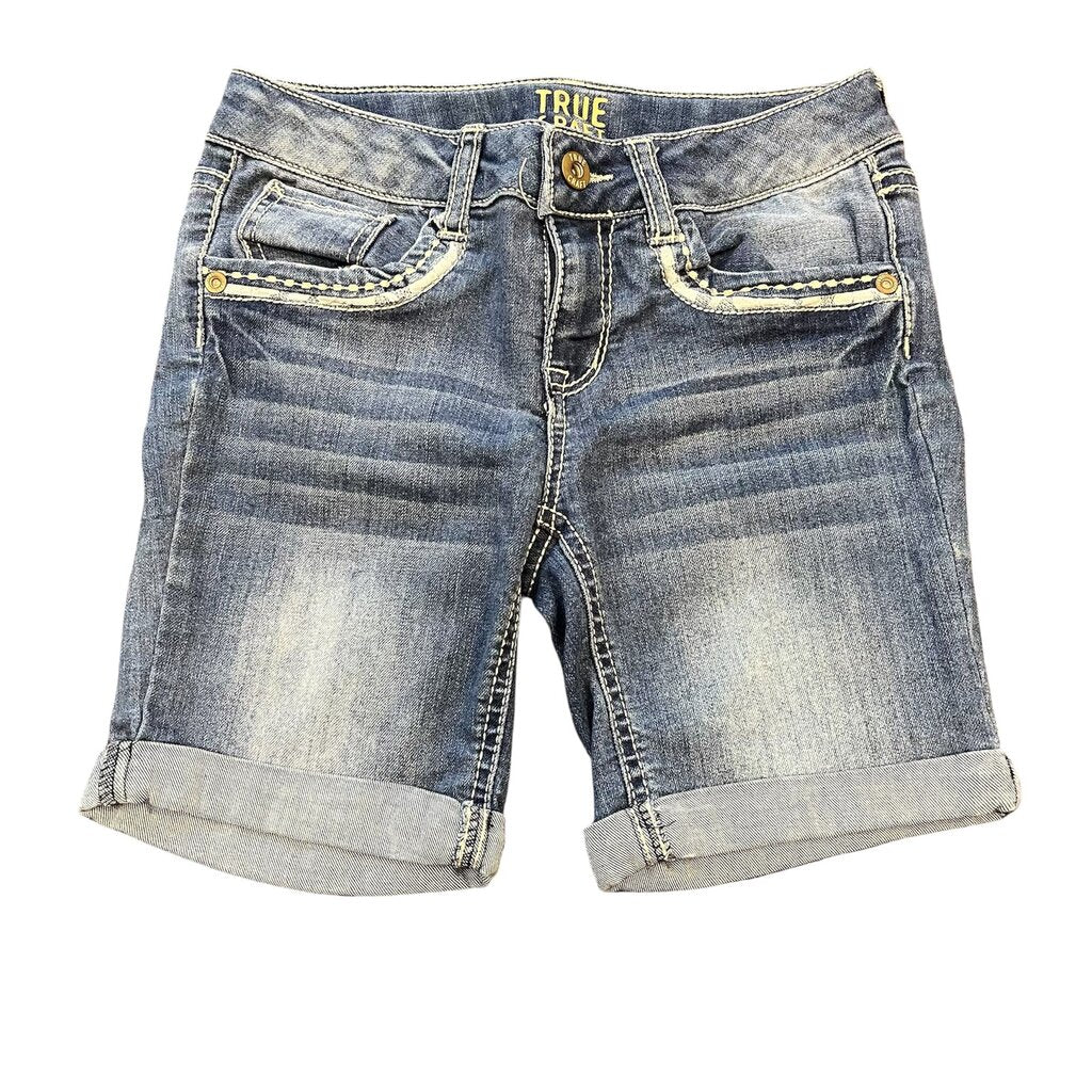 medium wash denim Bermuda shorts with lace detailing on the pockets