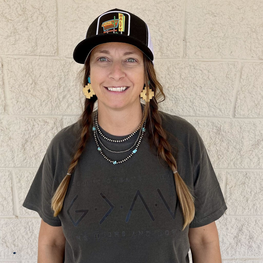 God is Greater than the highs and lows tshirt. Printed in matte black on pepper Comfort Colors tshirt.
