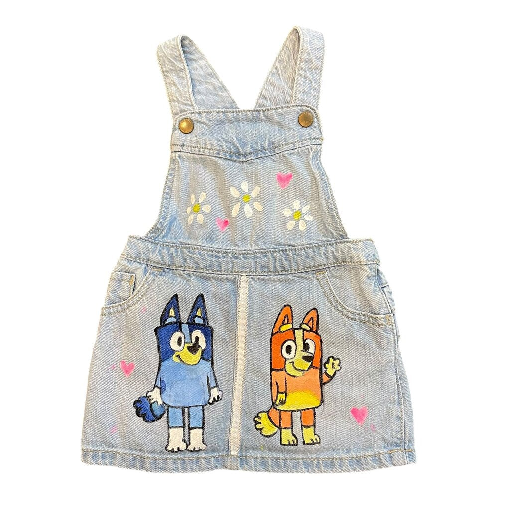 ON denim dress with hand painted Bluey and Bingo. Adorable one of a kind dress for your little one