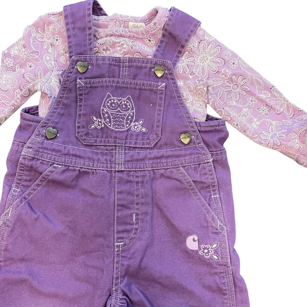 Purple denim overalls with embroidered detail. Comes with matching long sleeve onesie