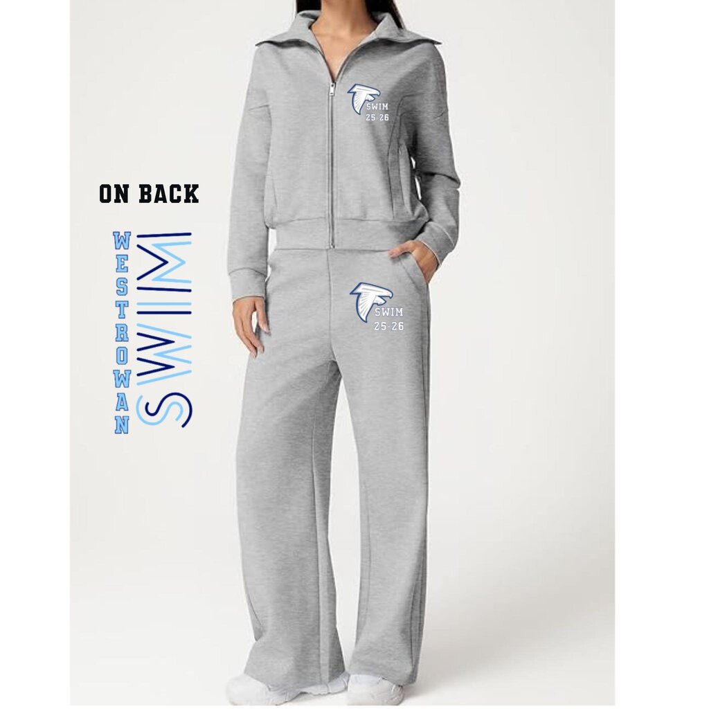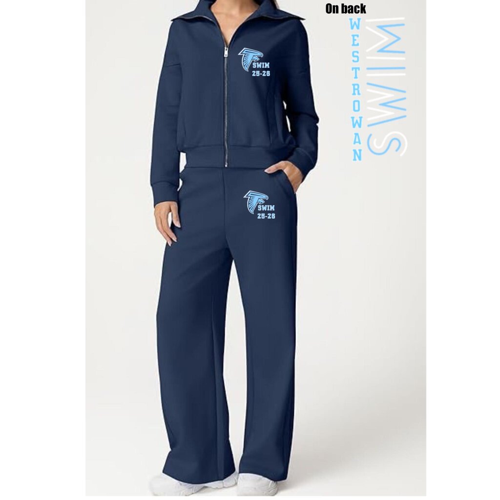 Women's cotton blend 2pc warm up. Full zip jacket with lapel and side pockets. Fleece wide leg pants. Available in navy or sport gray. Falcons swim logo on front pocket area and matching logo on leg. Can be customized with name for additional charge